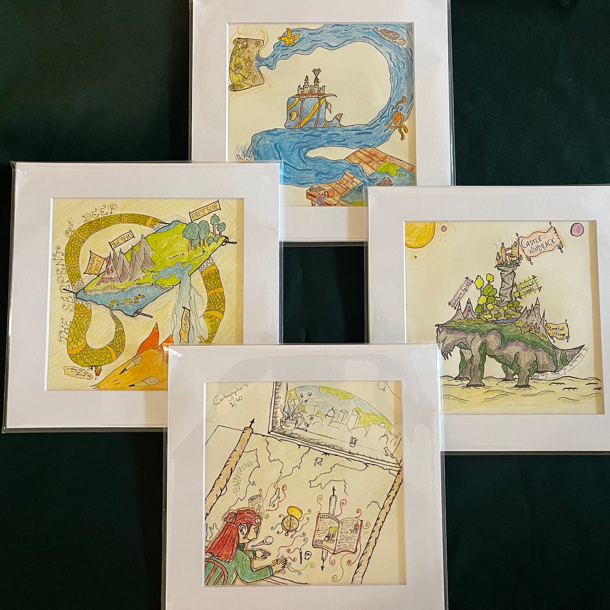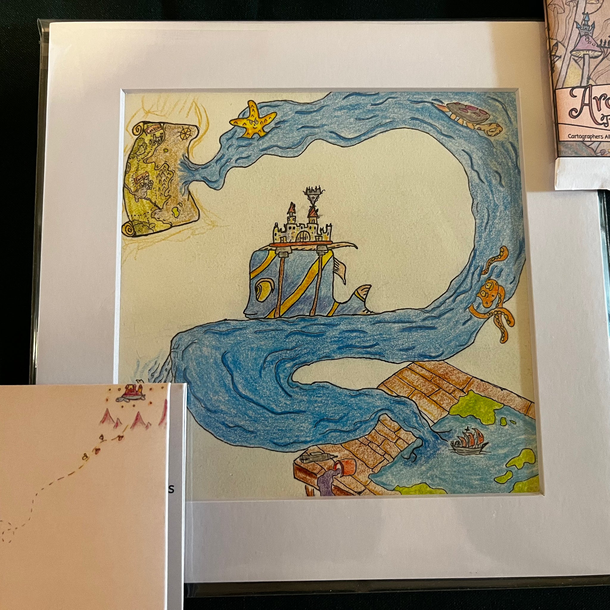 - An original drawing framed inside a 8"x8" white cardboard frame, sealed inside a cellobag.