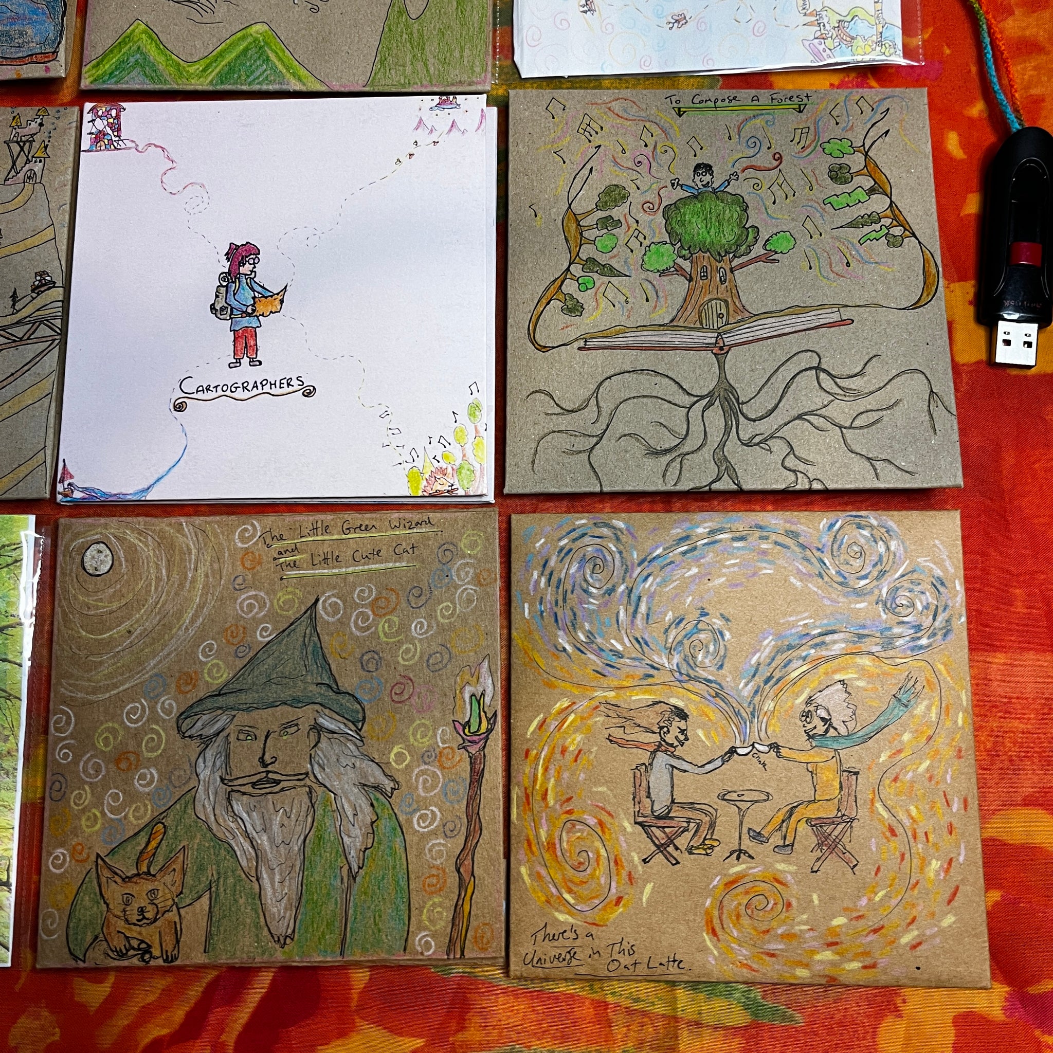 Each drawn by me, and each design unique for you, your own version of my older albums, including; Oceans in Her Hair (2019), The Little Green Wizard (2021), There's a Universe in this Oat Latte (2021), To Compose a Forest (2022), City Lights and Fireflies (2022) & The Castles we Build (2023).